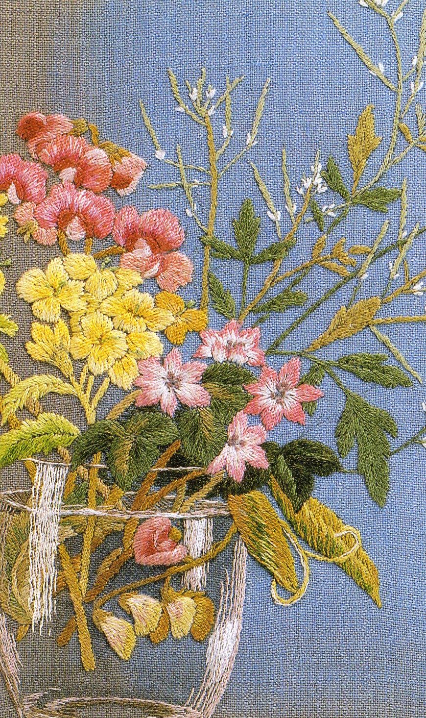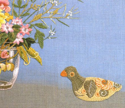 Yasuko Abe embroidery wuork: Clay decoy (Bitter cress Mustard flower Hepatica Sweet pea)